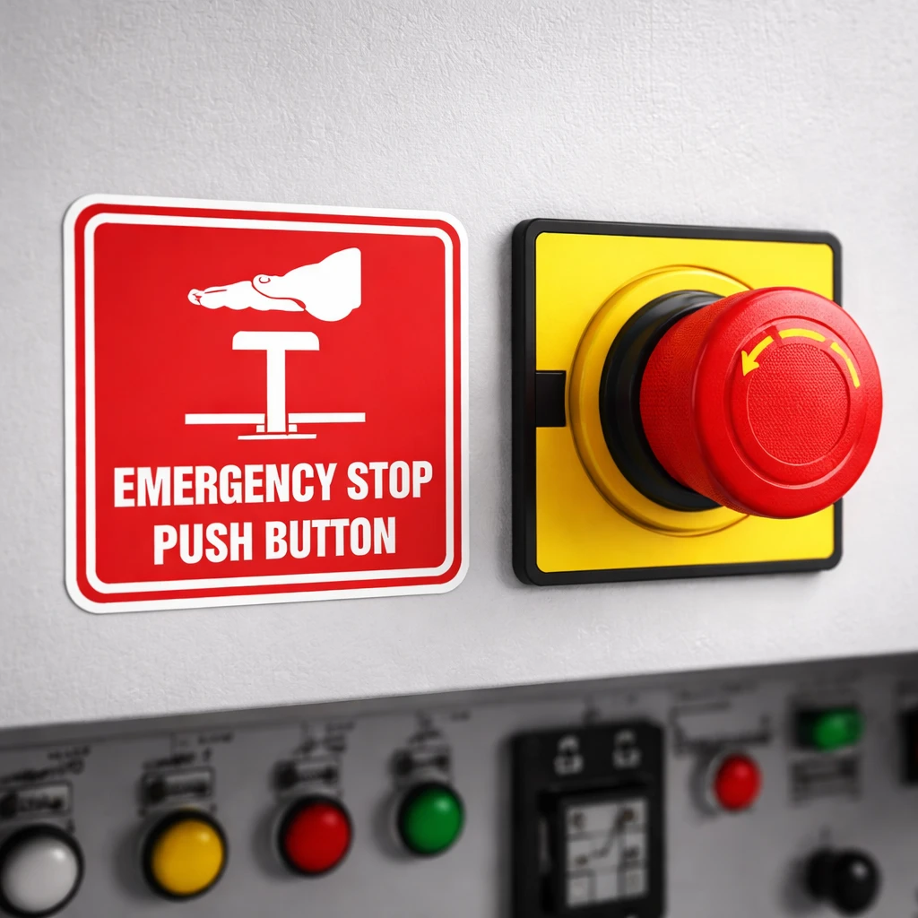 - Compliance: Many regulatory standards and guidelines mandate the use of specific labelling for emergency controls. This ensures that equipment meets safety requirements and facilitates inspections and audits.