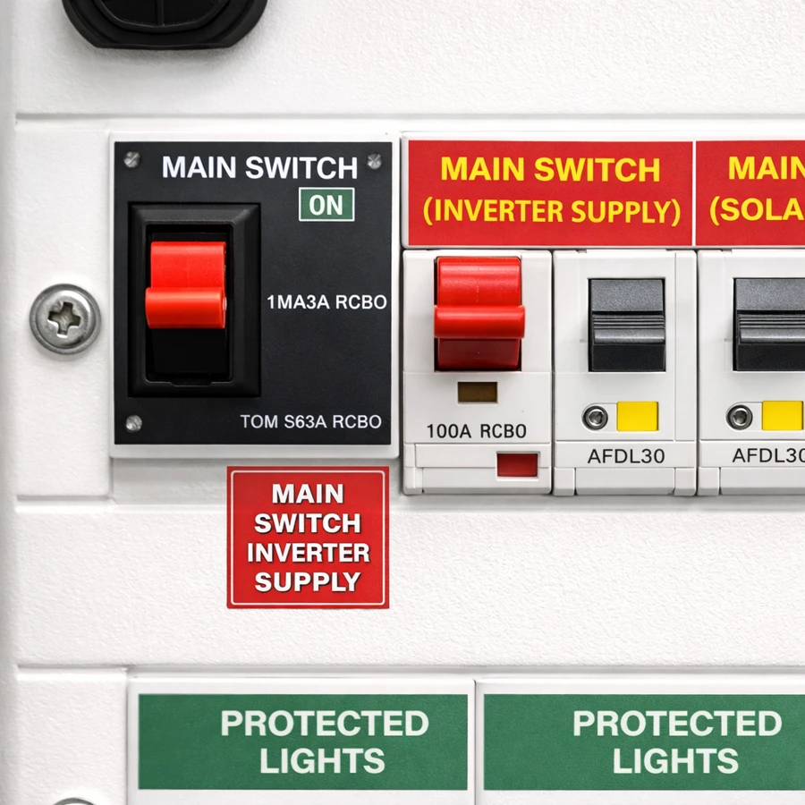 - Code Requirements: Helps meet regulatory standards and building codes that mandate proper labelling and identification of electrical equipment, including main switches supplying power to inverters in solar PV installations.