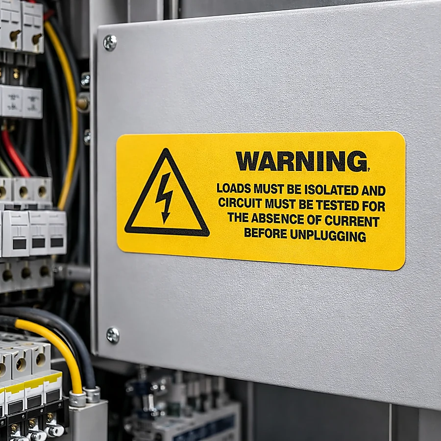 These labels are commonly installed on switchboards, control panels, industrial machinery and electrical distribution boards to remind technicians to isolate electrical loads before servicing.