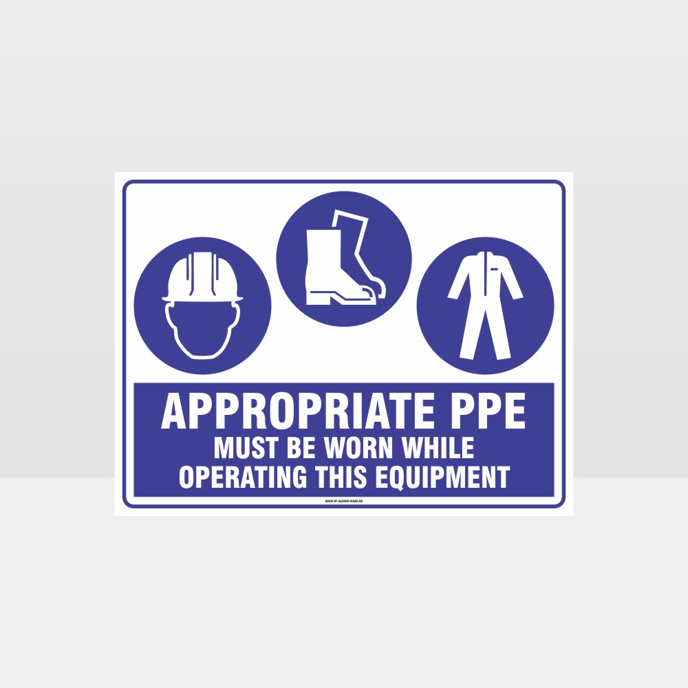 This Appropriate PPE Must Be Worn Operating Equipment sign: Mandatory or Blue safety signs as they are often referred as, are recognised by a white pictogram surrounded by a blue background and informs employees & visitors what actions must be taken to remain safe. This indicates the protective equipment required: Hat, Footwear and Clothing protection must be worn at all times in this area
