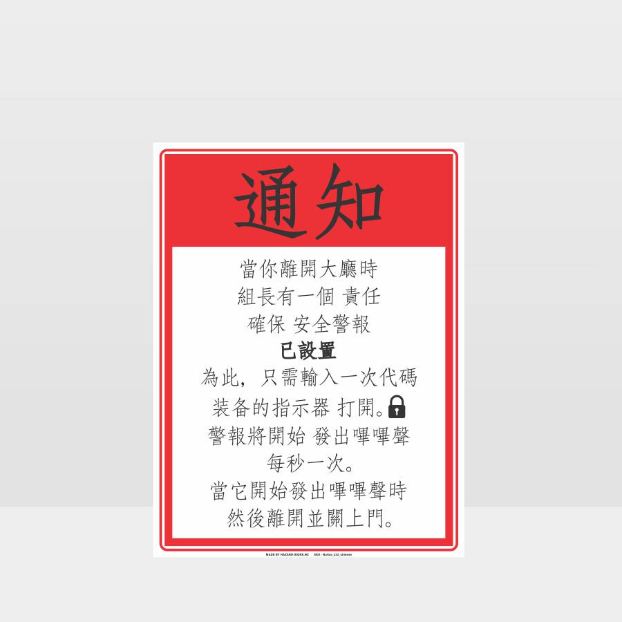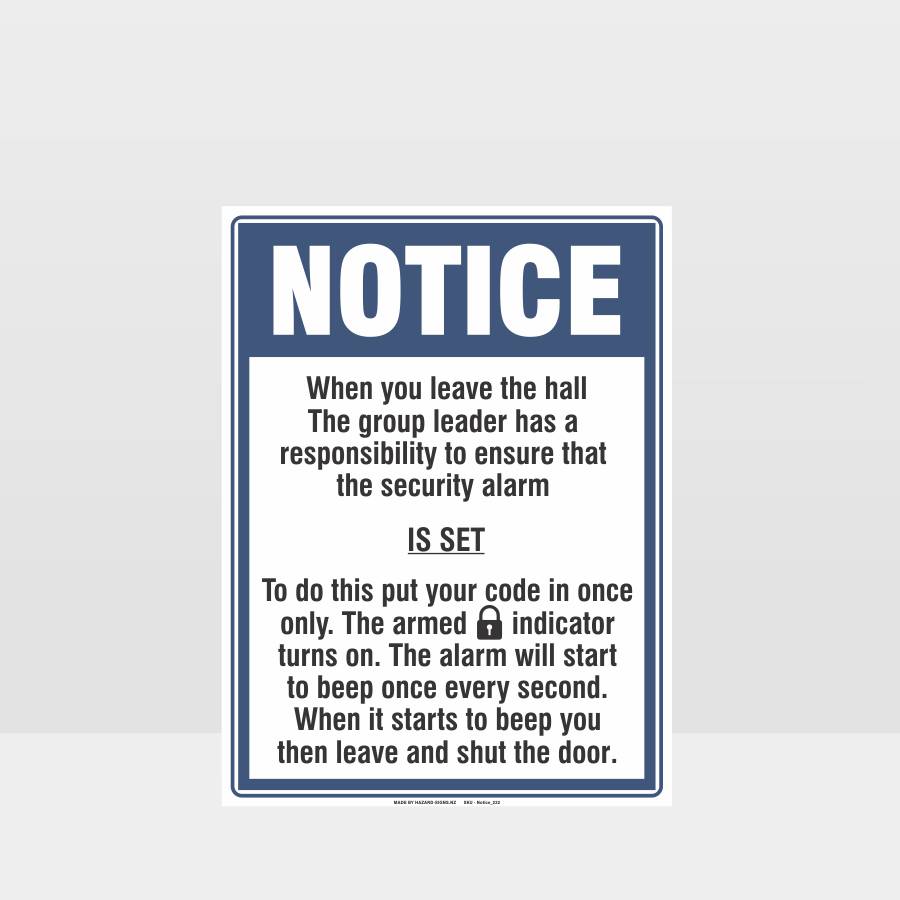 “Security Alarm Notice Sign” -The purpose of using the “Notice – When you leave the hall the group leader has a responsibility to ensure that the security alarm is set” sign is multifaceted: