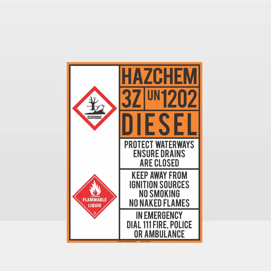 Our Hazardous 3Z 1202 Diesel Signs meet HSNO and UN requirements for diesel storage and transport signage. Featuring the Hazchem 3Z code and UN number 1202, these signs give first responders critical information about firefighting methods and spill containment procedures.